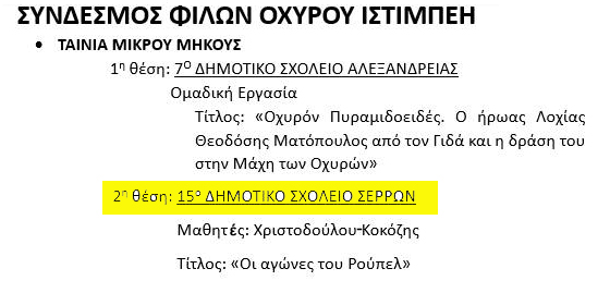 Ο 7ος Διεθνής διαγωνισμός του «Συνδέσμου Φίλων Οχυρού Ιστίμπεη», ολοκληρώθηκε. Μπράβο στους μαθητές μας Στέργιο και Δημήτρη για την επιτυχία τους με την κατάληψη της 2ης θέσης στην κατηγορία "Ταινία Μικρού Μήκους".